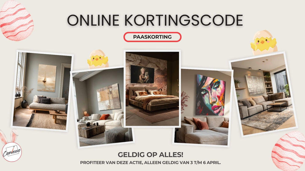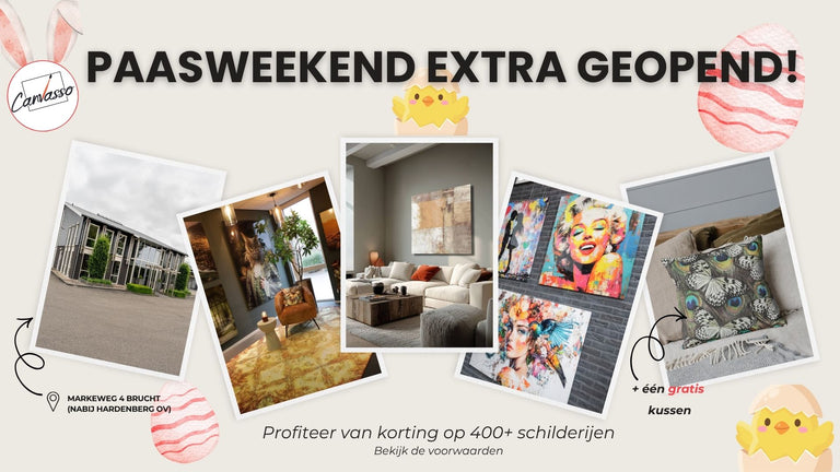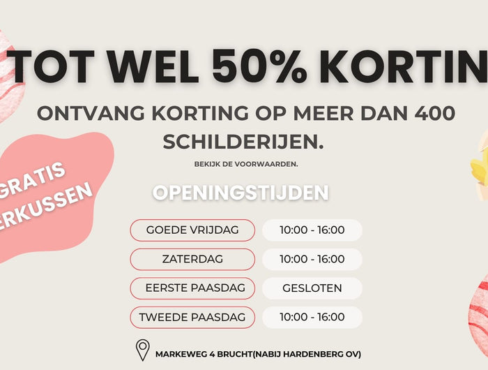 Tijdens het paasweekend hebben we een speciale actie voor onze klanten. Kom langs in onze showroom en profiteer van maar liefst 50% korting op een groot deel van onze collectie wanddecoratie.