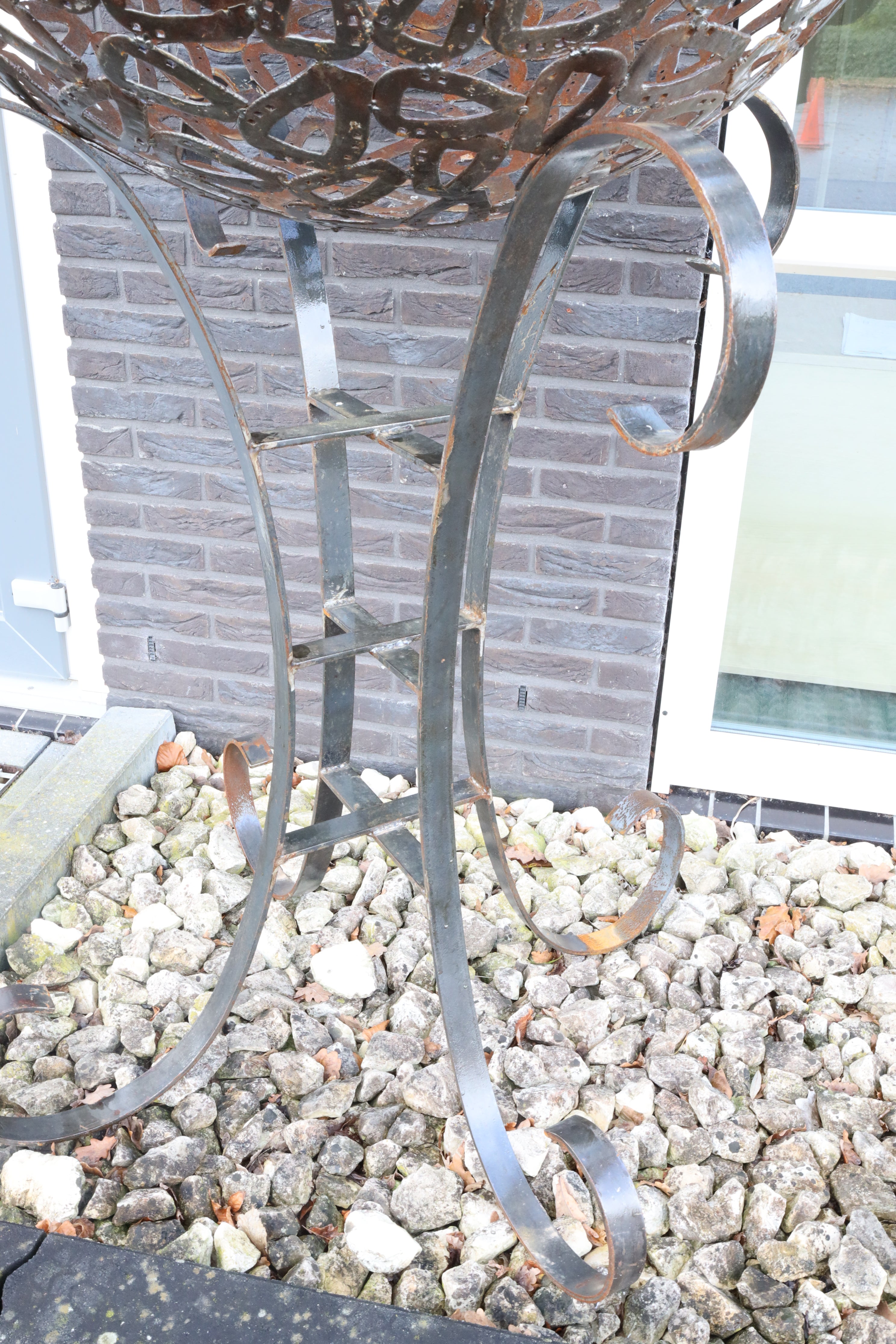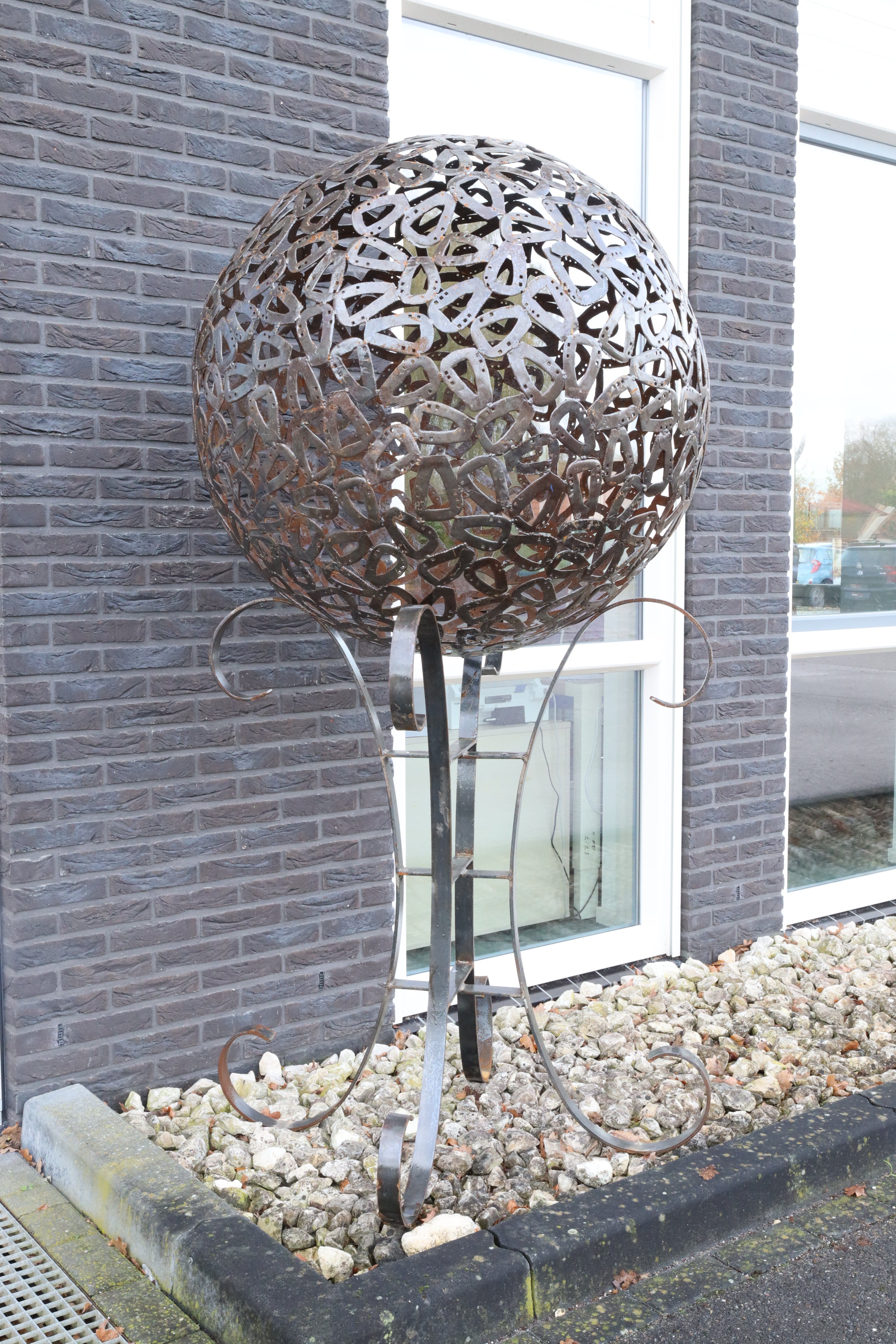 Het kunstwerk “Wereldbol” vangt de harmonie tussen natuur en metaal in een sierlijke, bijna gewichtloze vorm. Deze opengewerkte bol, opgebouwd uit mooie metalen patronen, lijkt te zweven op elegante, krullende poten. Het samenspel van licht en schaduw door de uitgesneden vormen creëert een voortdurend veranderend schouwspel.