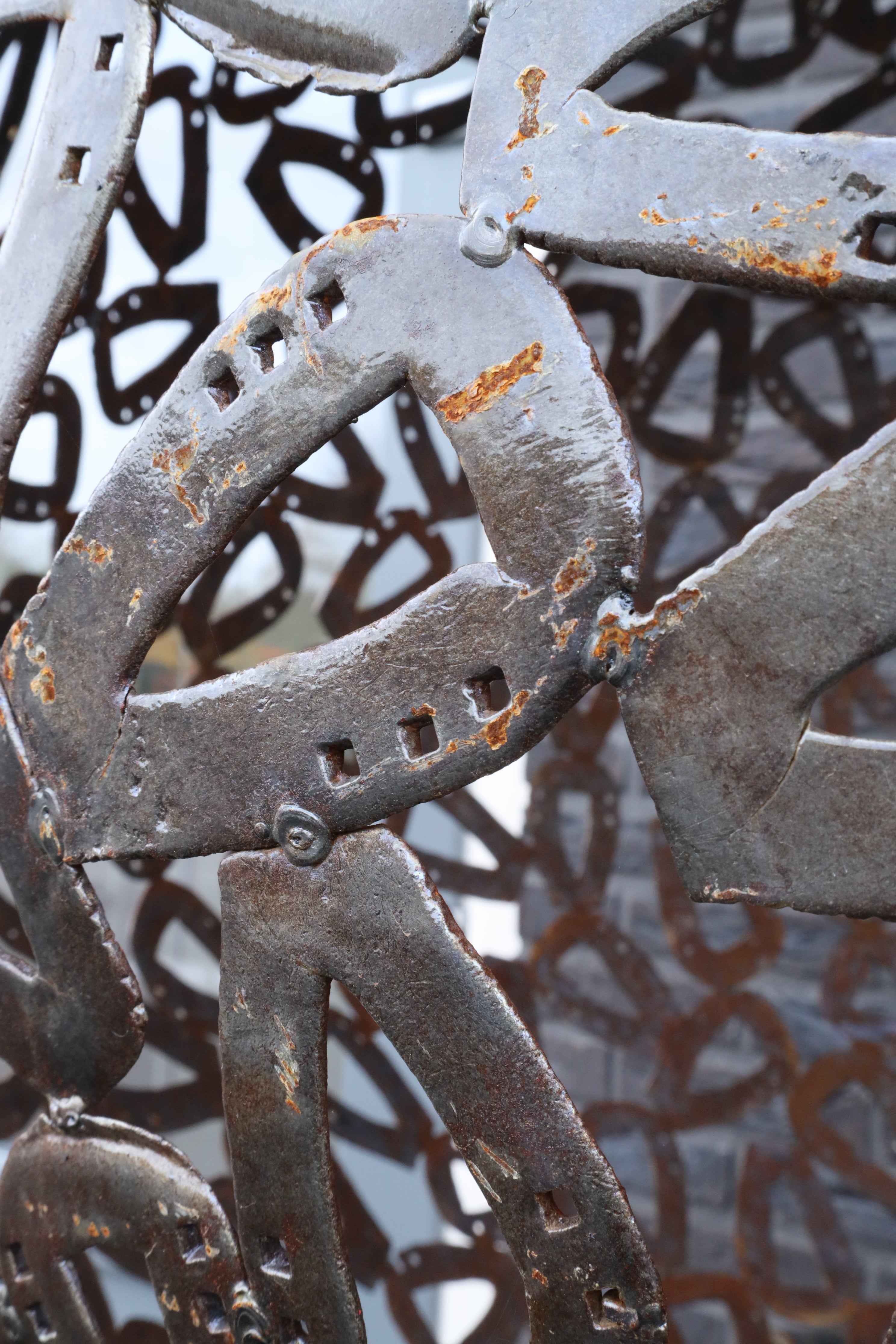 De sculptuur heeft een moderne, tijdloze uitstraling en vormt een opvallend middelpunt in elke ruimte. Het gebruik van bewerkt metaal geeft het geheel een karaktervolle, industriële touch, terwijl de ronde vormen en open structuur zorgen voor zachtheid en elegantie.