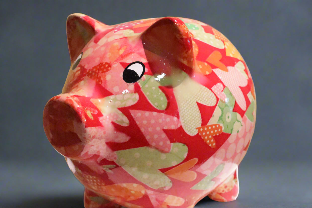 Design: vrolijk spaarvarken met rode, roze en witte hartjes