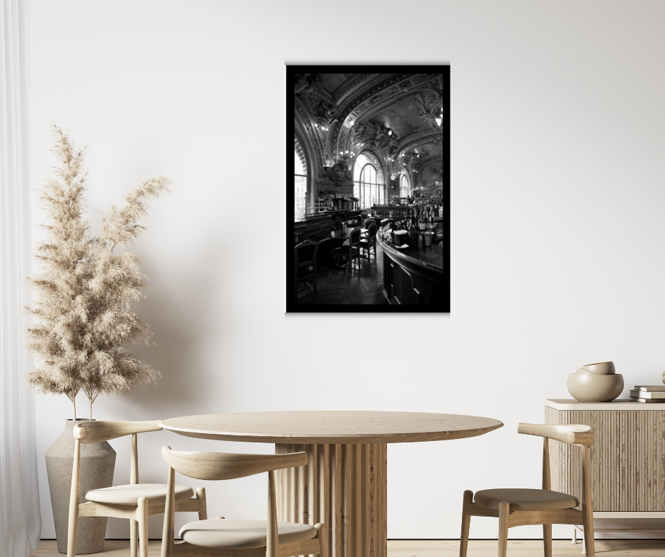 Ontdek deze prachtige gelamineerde ingelijste poster, met een formaat van 60 x 80 cm. Op de poster is een foto van een chique restaurant afgebeeld, van fotograaf Jos van Riel. Deze poster in het zwart-wit is een tijdloos item en een mooie eyecatcher voor je interieur.