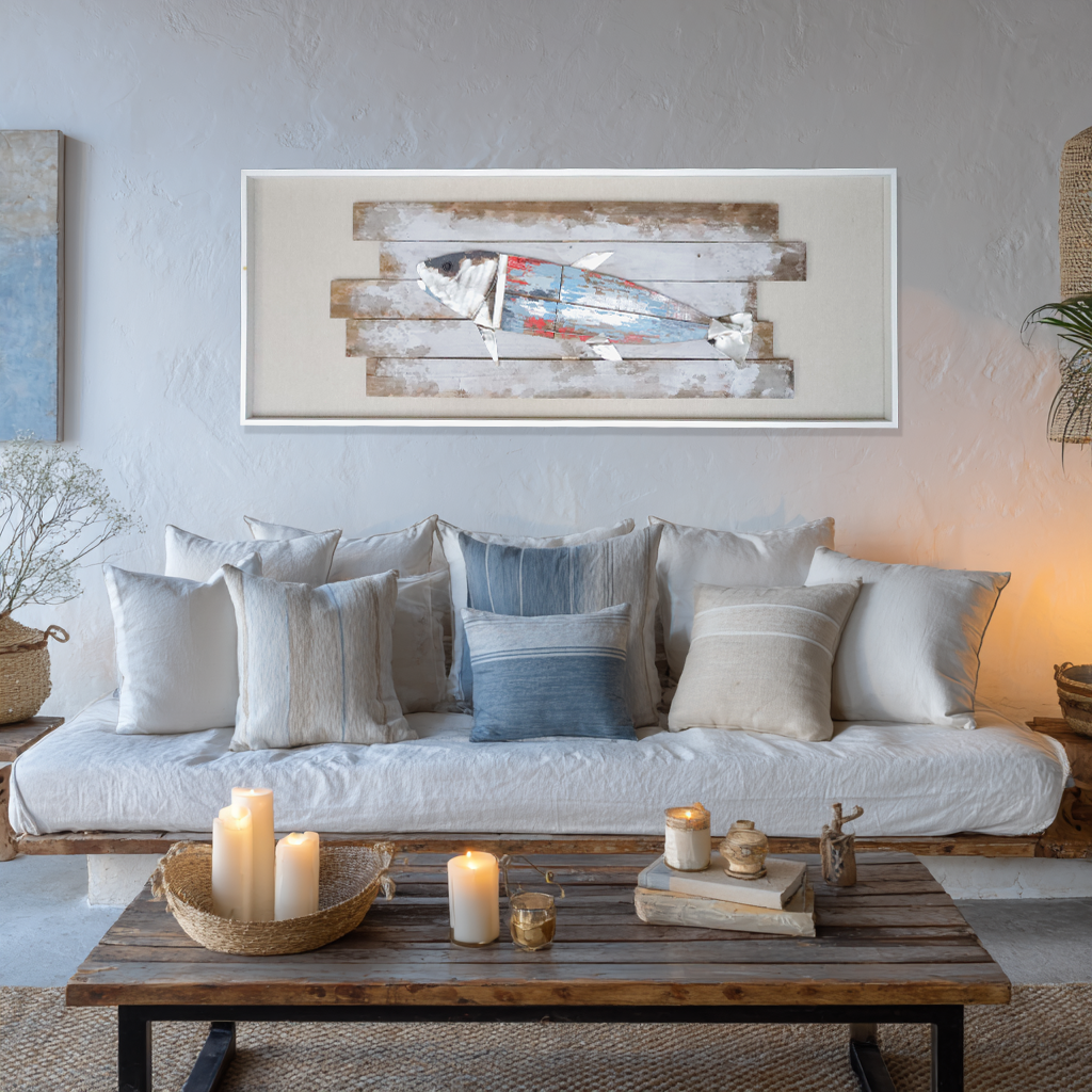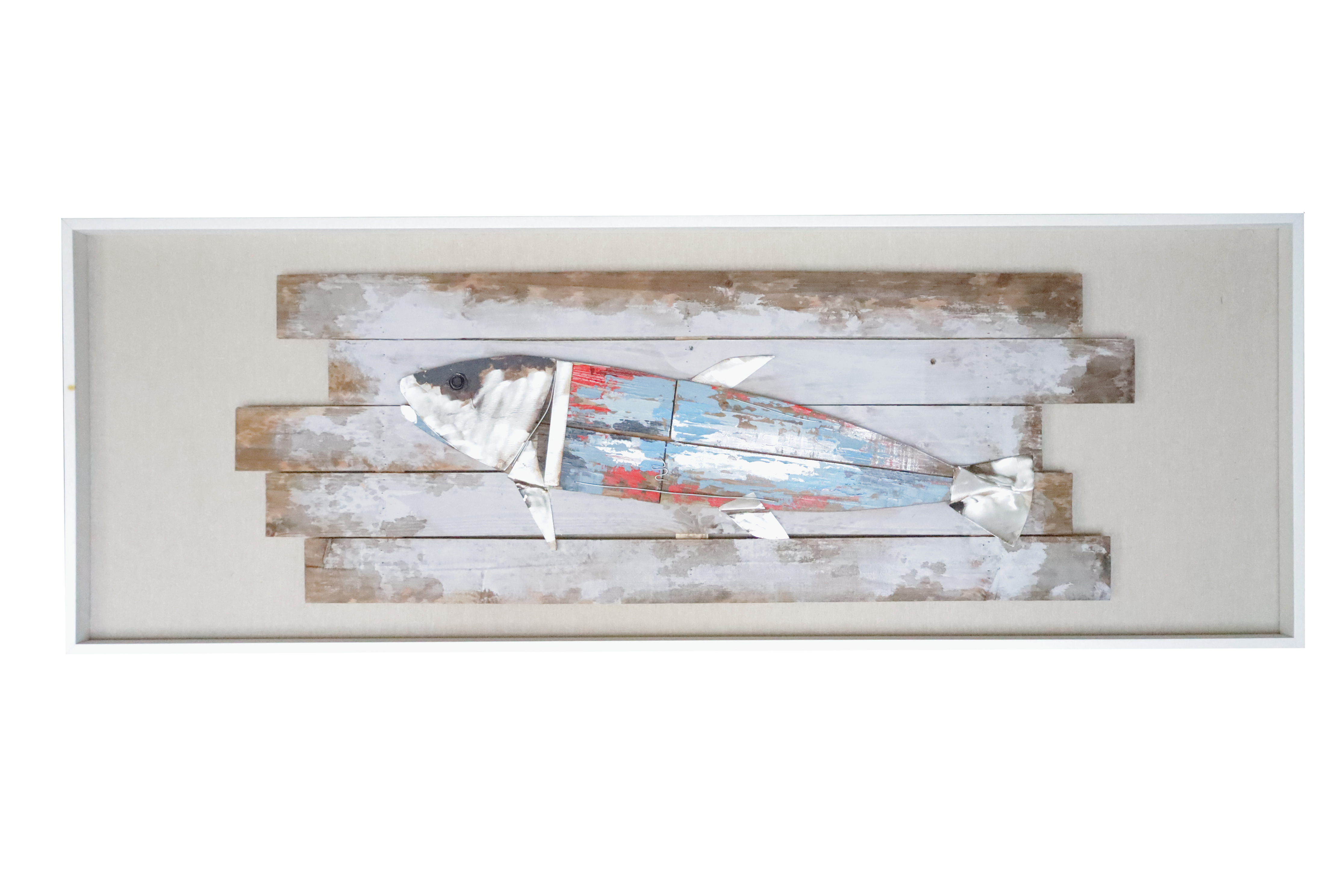 Rusty Tide is een bijzonder kunstwerk dat het robuuste karakter van gerecycled metaal combineert met de natuurlijke vorm van een vis. Handgemaakt op verweerde houten planken, straalt dit werk pure ambacht uit. De metalen vis is opgebouwd uit verschillende onderdelen, met lagen verf die bewust versleten ogen – een knipoog naar de schoonheid van imperfectie en vergankelijkheid.