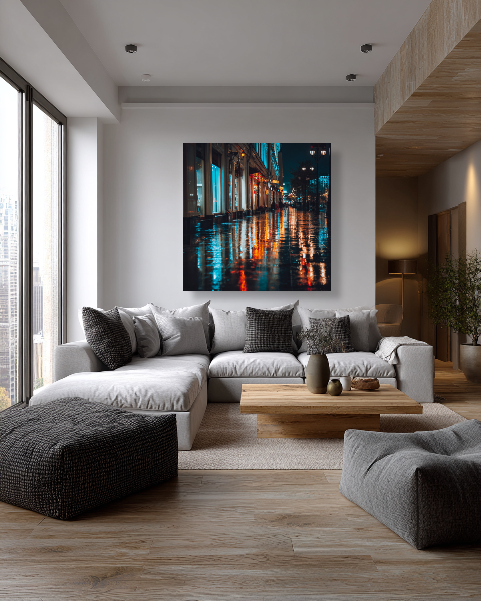 Dit schilderij vangt de sfeer van de stad bij nacht. De glimmende straatstenen weerspiegelen de kleurrijke lichten van etalages en lantaarns, waardoor er een levendig spel van blauw en oranje ontstaat. De regen maakt het plaatje stil en kalm.