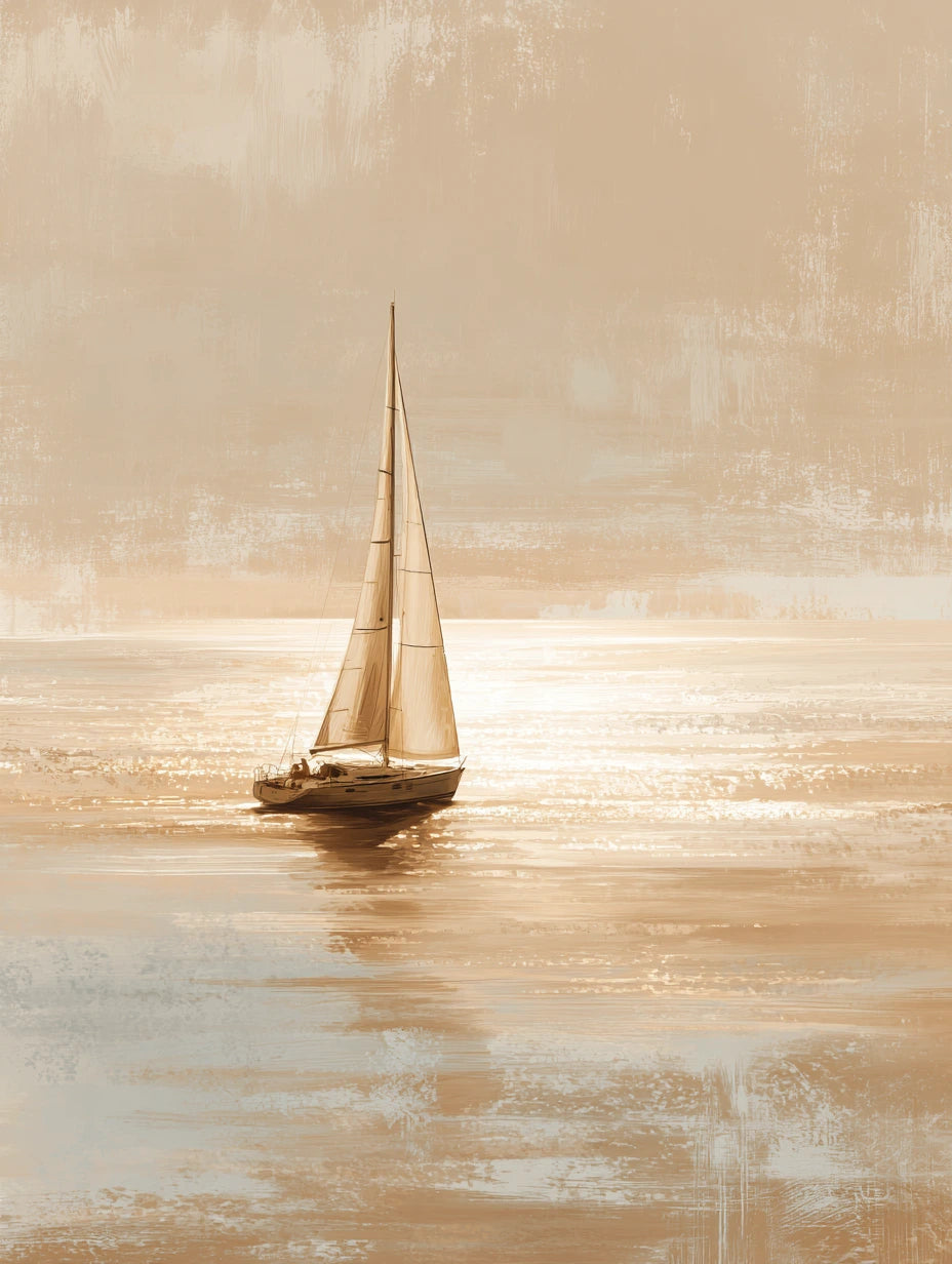 Sailing Serenity 2.0 is een stijlvol zeilboot schilderij dat kunst en rust samenbrengt in een verfijnde vorm van wanddecoratie. De geschilderde zeilboot, uitgevoerd in zachte beige en zandtinten, straalt vrijheid, stilte en elegantie uit. Door de schilderachtige uitstraling en subtiele penseelstructuur voelt dit kunstwerk warm, tijdloos en puur aan.