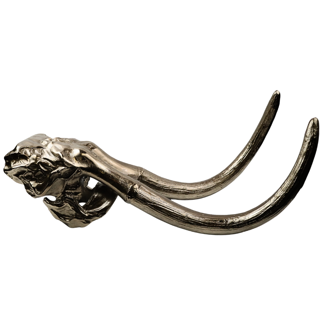 Met deze grote mammoet schedel in een antiek messing finish haal je een echt statement in huis. Het robuuste ontwerp en de rijke afwerking maken dit stuk tot een bijzondere blikvanger die kracht en historie uitstraalt. Of je nu houdt van stoere accessoires, een vleugje prehistorie in je interieur wilt brengen, of gewoon een uniek object zoekt? Deze schedel past perfect.